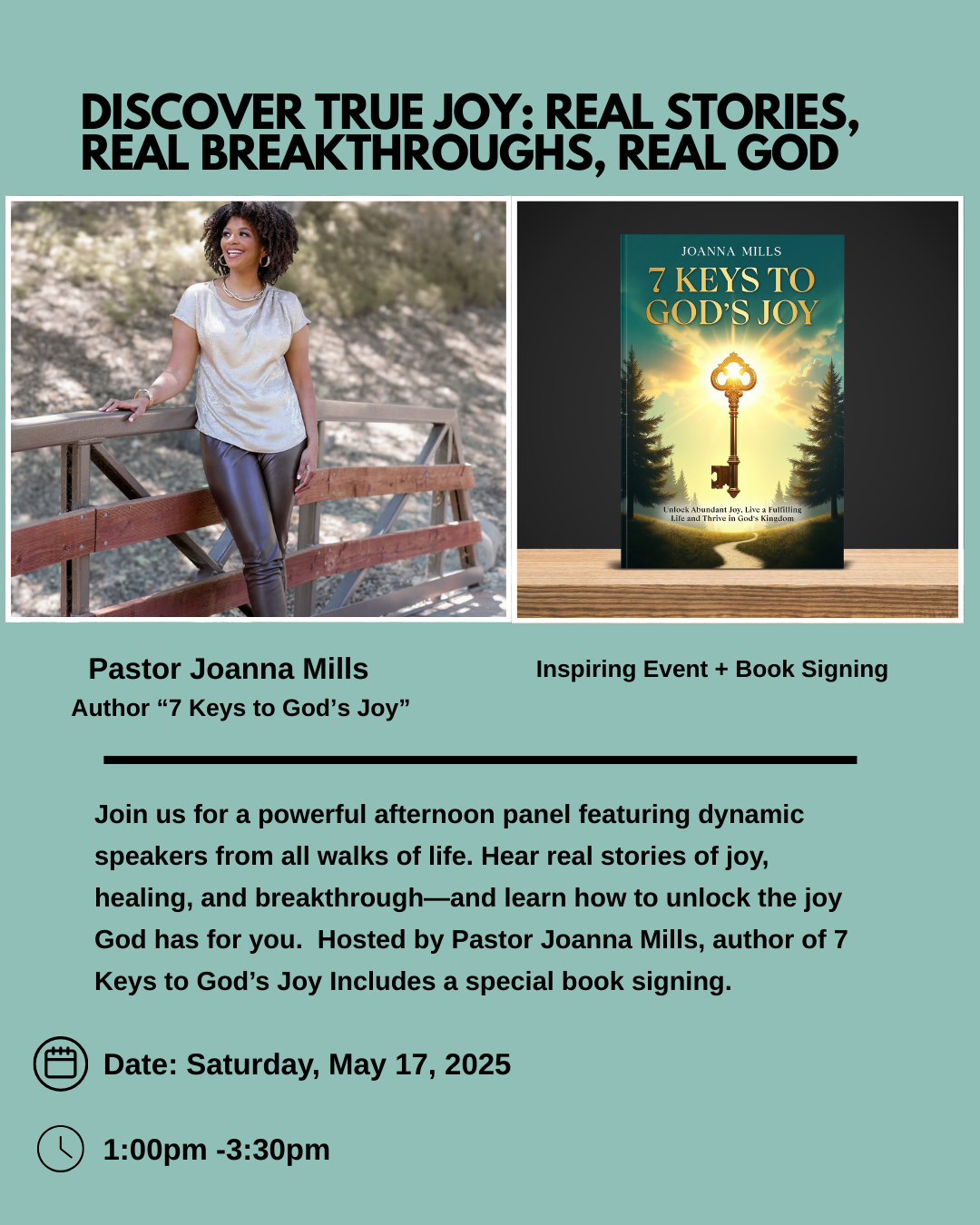 Pastor Joanna Mills is a dynamic speaker, author, and spiritual leader with a passion for helping others unlock joy, hope, and their God-given purpose. With experience in ministry, media, event leadership, and personal transformation, she is known for her relatable teaching style and heartfelt messages that blend scripture, testimony, and practical truth. Joanna is the author of 7 Keys to God’s Joy, a powerful faith-based guide that equips believers to live with purpose, hope, and spiritual resilience. She also serves as an Associate Executive Pastor at Global Revival Fire Church, where she leads with vision and supports the growth of kingdom-minded initiatives. Whether teaching on stage, leading workshops, or sharing through digital platforms, Joanna’s mission is to help people fulfill God’s promises—so they can experience tangible joy that empowers them to thrive both now and for eternity. Pastor Joanna is a proud mother to her son, Craig. In her free time, she loves spending time with family, enjoys dancing, and traveling the world.